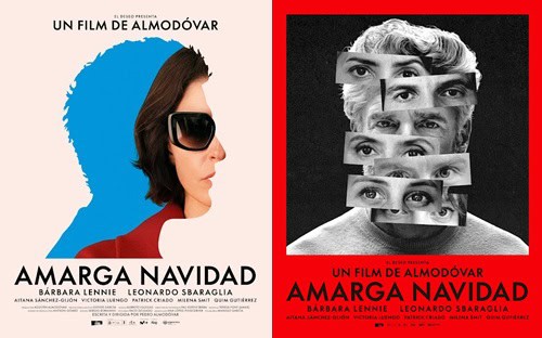 Es bien sabido que en el cine de Almodóvar las piezas de sus puzles narrativos no siempre terminan de encajar, ni siquiera en obras mayores como Dolor y gloria (2019), quizá la referencia más cercana a Amarga Navidad. Aquí, los momentos de auténtica lucidez conviven con otros innecesariamente subrayados, en una estructura que oscila entre la intuición y la sobreexplicación. Algo similar sucede con los dos carteles que han acompañado el lanzamiento de la película (ambos obra del ilustrador Javier Jaén): uno, elegante y sugerente, propone un inquietante juego de identidades al inscribir el rostro de Bárbara Lennie en el de Leonardo Sbaraglia, condensando en una sola imagen la lógica vampírica y especular que articula el filme; el otro, en cambio, mucho más plano y funcional, reúne los rostros de los múltiples personajes en una composición frontal que parece ensamblada a golpe de Photoshop, sin rastro de esa ambigüedad fértil. Entre esos dos polos se mueve también Amarga Navidad, cuyas secuencias a veces encajan con fluidez y verdadero genio en el montaje, y otras, en cambio, lo hacen forzadas, a martillazos.